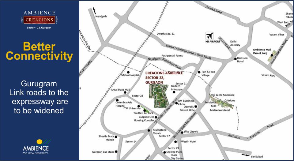 Extended in 15 acres of land Ambience Creacions Sector 22 offers premium fully fitted 3 /4 BHK apartments and penthouses in sector 22 Gurgaon with major specifications that includes air-conditioned condominiums, ready to move in apartments, with stamp of quality of Ambience, water features and much more. The apartment area sizes are from 1380 sq. ft. and go up to a whopping 3976 sq. ft., providing luxury space in each and every residential unit. The place encompasses 65% open area that would make you feel close to nature and greenery. With exquisite architecture, design and standard filled with natural beauty, Ambience Creacions is everything you have ever wished for in your residential area. Designed for the discerning global citizen, life here is everything you could ever want. Envisioned as a residential area of international importance and standards, the lifestyle here is comfortable as well as luxurious, with a well-appointed clubhouse, landscaped courtyards, all situated in one of the best possible location in Gurugram.