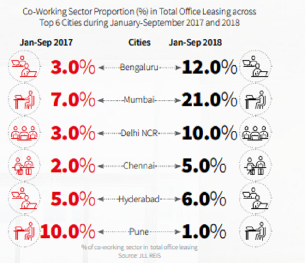 According to the report, co-living in Delhi NCR will constitute nearly 40% of this potential market opportunity. Affordability, convenience and community are the pull factors for the migrant millennial workforce. This will drive the growth in the co-living space. Share of co-working space in office leasing will increase manifold in the near future. Mumbai records the highest proportion of co-working space to office leasing in 2018.