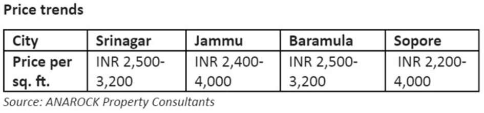 Jammu has experienced some infrastructure growth with apartments, restaurants and stores coming up, and the region has been largely peaceful. With these factors, price trends in the Jammu region have gone up. According to Makaan.com price trends, the price of property in Jammu starts at Rs 2.8 lakh, while the average price is Rs 69.07 lakh. The average price per square foot is about Rs 2,300. However, dealers express concerns about the Kashmir region. Positive market sentiment is necessary along with job creation and infrastructural development by the government. A stable political atmosphere is important, even from an investor perspective. CII has also recommended a 10-point policy agenda advocating economic growth here, including sustainable industrial growth, creating a climate of investment and a boost to sectors such as tourism, infrastructure and connectivity, agriculture and horticulture, and renewable energy.