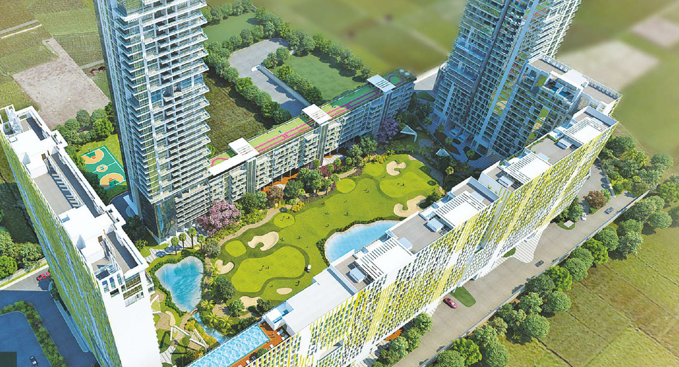 • The project has a 10-meter high grand entrance, palm lined Entrance Boulevard, lavish balconies with 6’to 10’width serving as your extended living spaces and master suites, living room and main balcony overlooking the Golf Themed Central landscape.