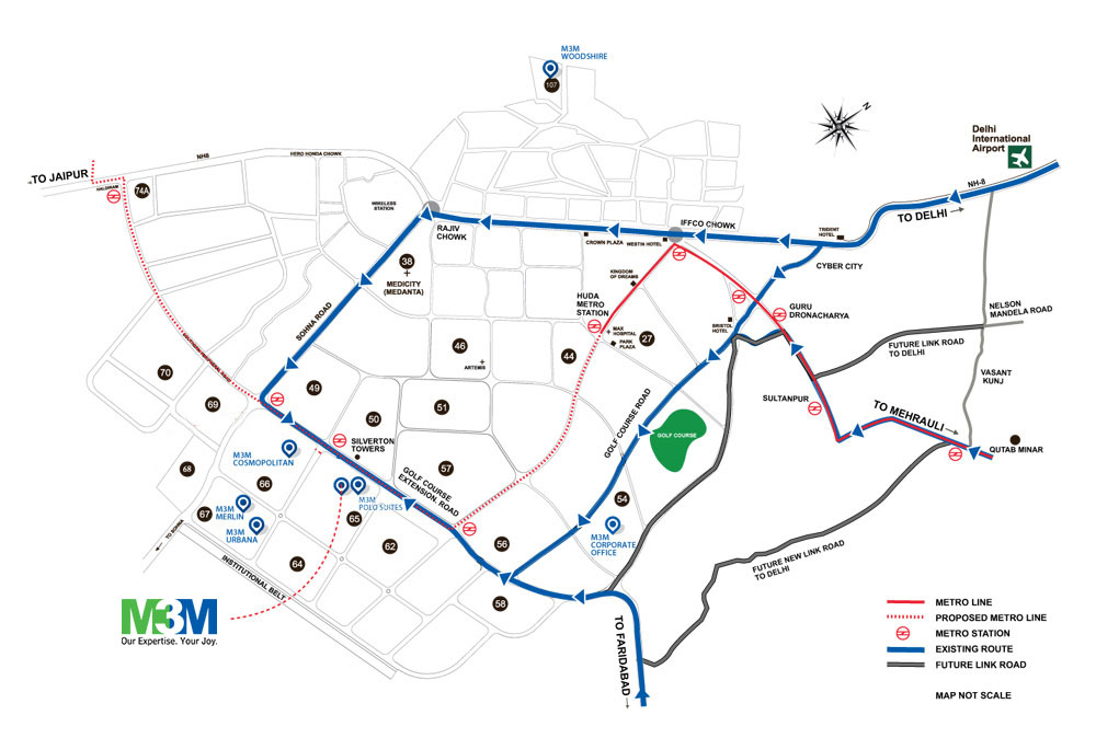 - M3M City Heights is just 30 Minutes’ Drive from the Indira Gandhi International Airport, Its connected to Delhi via NH8 & Faridabad Expressway.